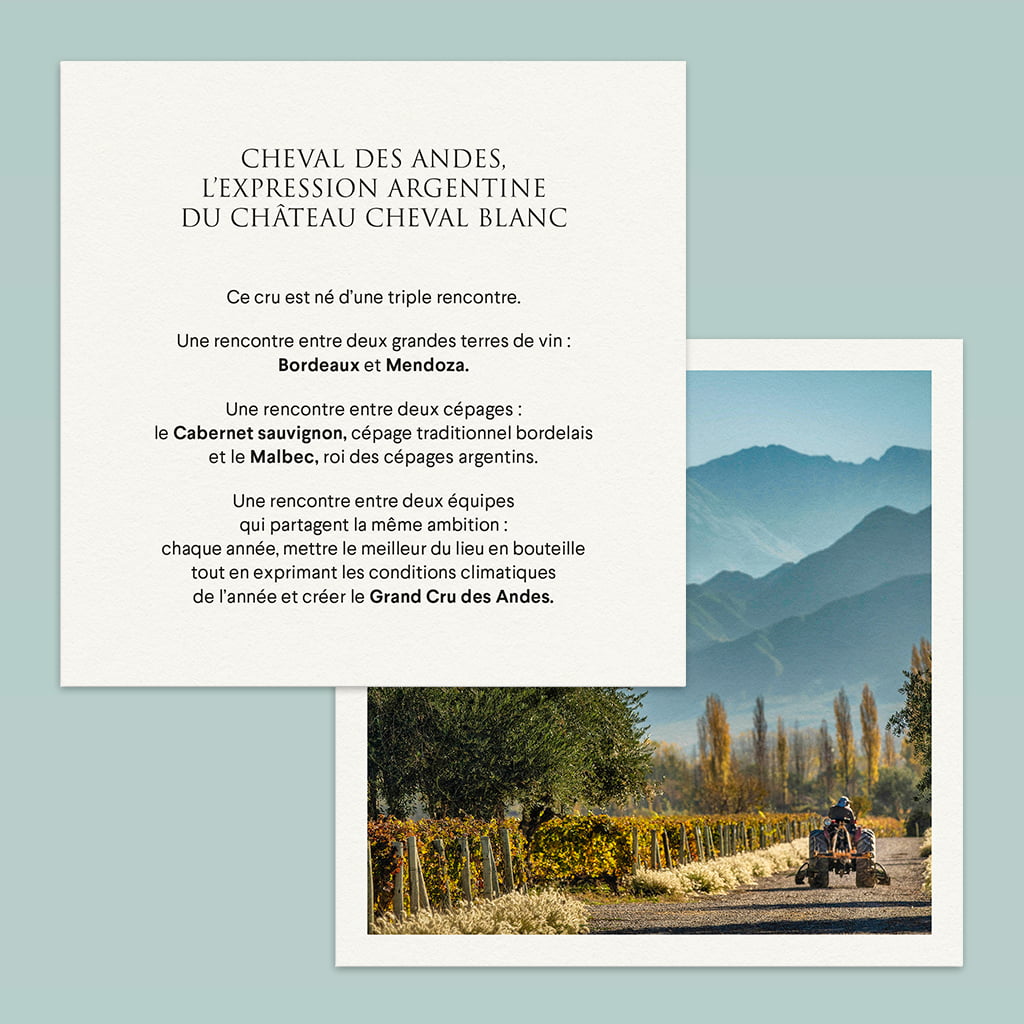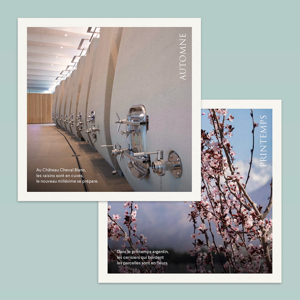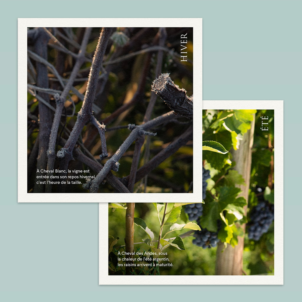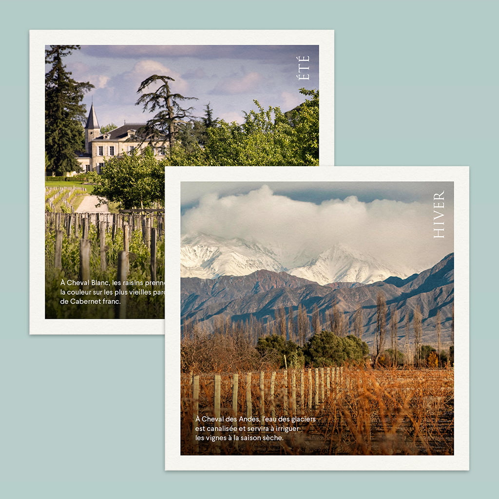 La carte de vœux prend ainsi la forme d’une pochette invitant au voyage entre les domaines de Cheval Blanc et Cheval des Andes, à l’aide de cartes présentant les activités viticoles mises en regard au fil des saisons.
