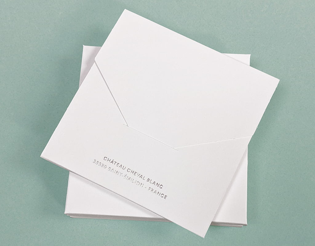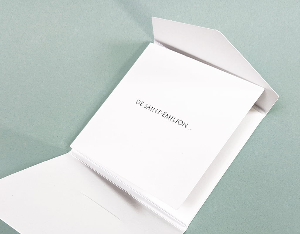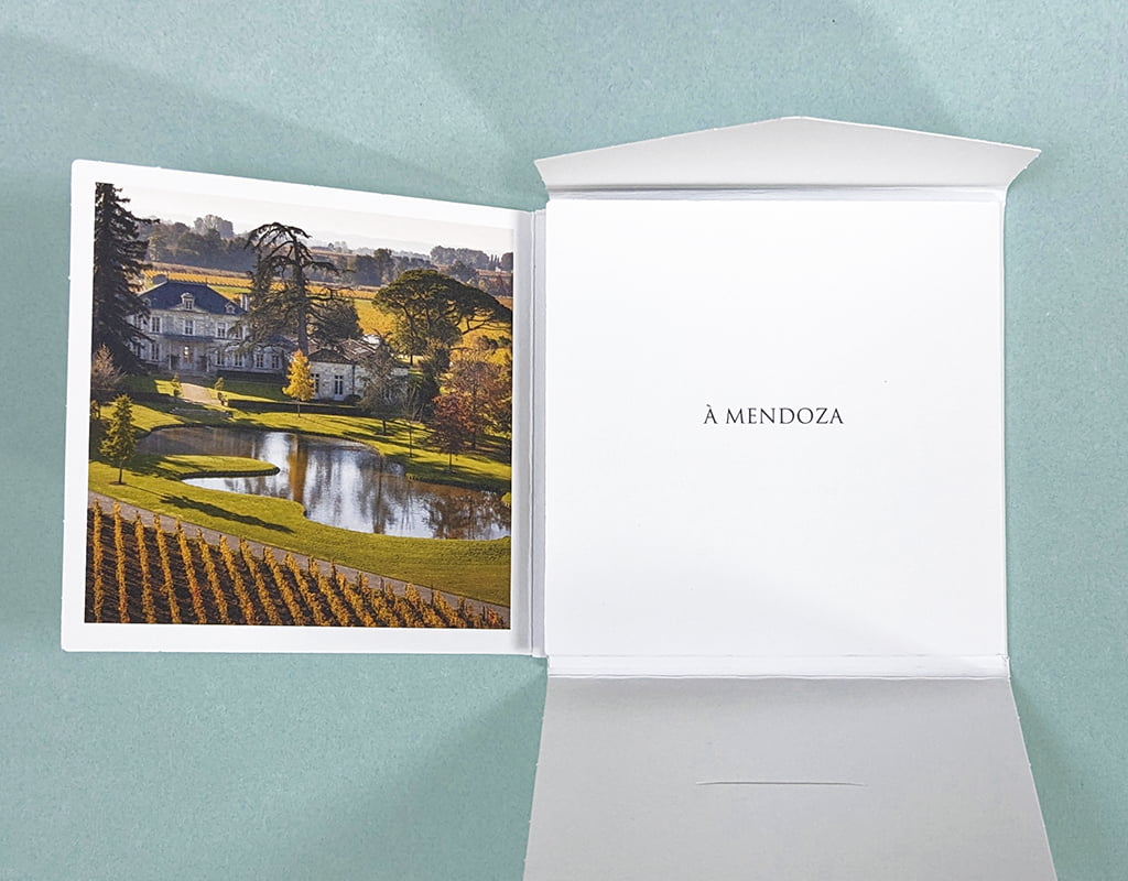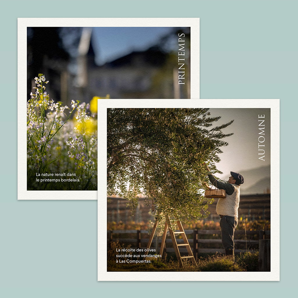 La carte de vœux prend ainsi la forme d’une pochette invitant au voyage entre les domaines de Cheval Blanc et Cheval des Andes, à l’aide de cartes présentant les activités viticoles mises en regard au fil des saisons.