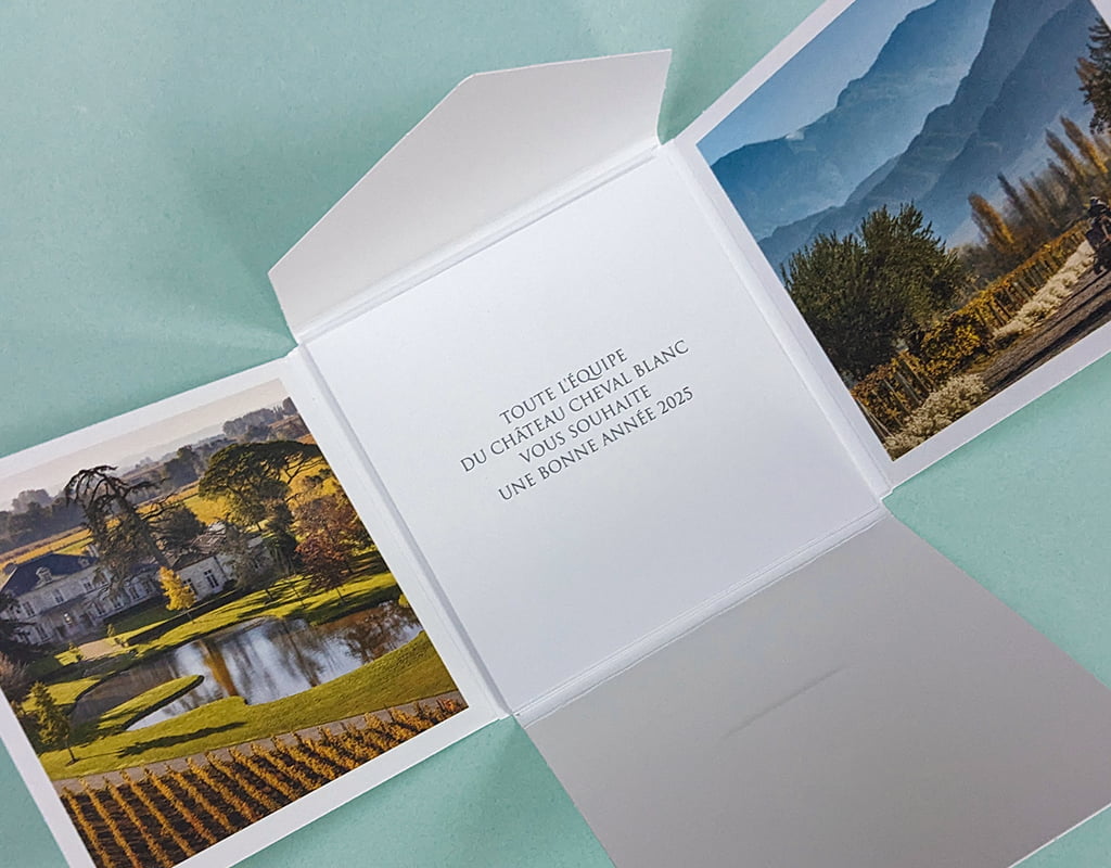 Conception de la carte de vœux 2025 de Cheval Blanc, domaine viticole d’exception situé sur la commune de Saint-Émilion.